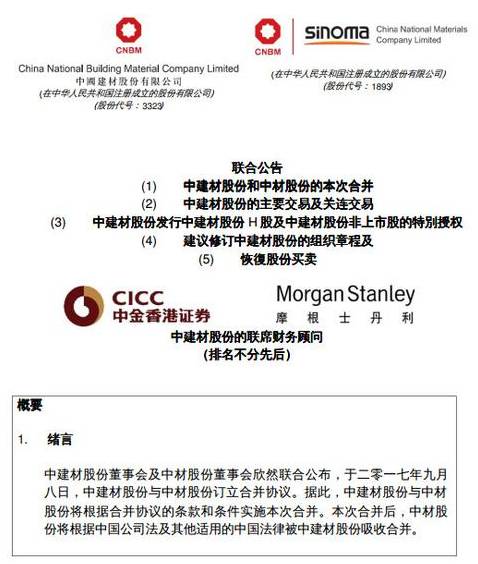 而在公告前一天7日上午,中國(guó)建材、中材股份在香港停牌,等待根據(jù)香港收購(gòu)及合并守則刊發(fā)內(nèi)幕消息。隨后,中建材集團(tuán)旗下多家上市公司像約好了似的,齊齊停牌,中國(guó)巨石、中材國(guó)際、寧夏建材、祁連山上交所停牌,北新建材、天山股份、中材科技深交所停牌,原因還都是擬披露重大事項(xiàng),引發(fā)外界無(wú)數(shù)猜想,“中國(guó)神材”的合并重組時(shí)代來(lái)臨!