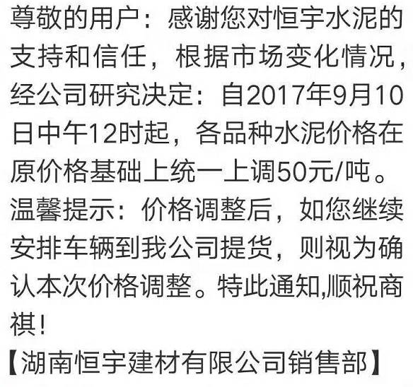 根據當前市場形勢及產銷存情況,我公司決定于2017年9月14日上午8:00對各品種水泥上調30元/噸,如您繼續(xù)安排提貨,則視為認同此次價格調整。