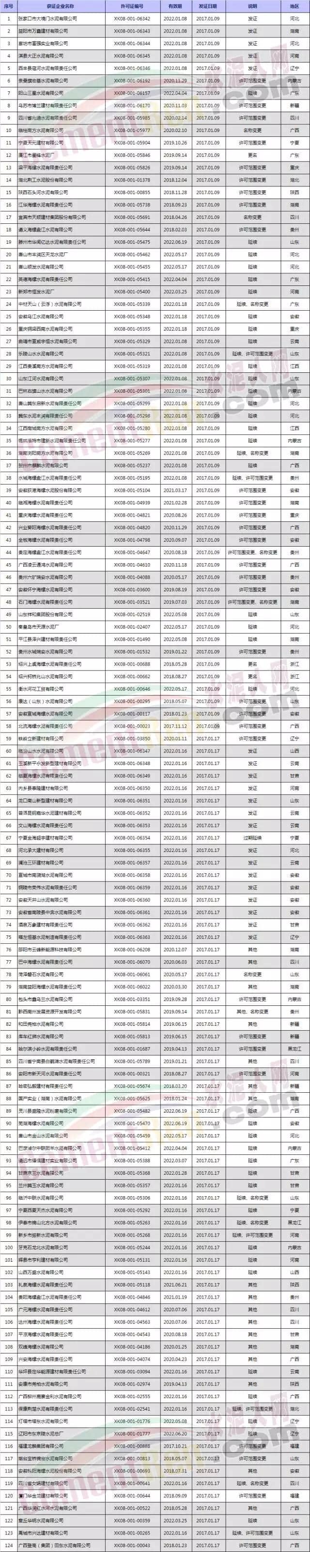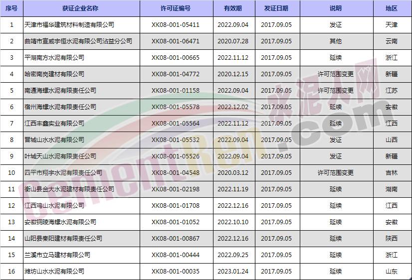 表9:2017年9月份發(fā)證水泥企業(yè)(共16家)
