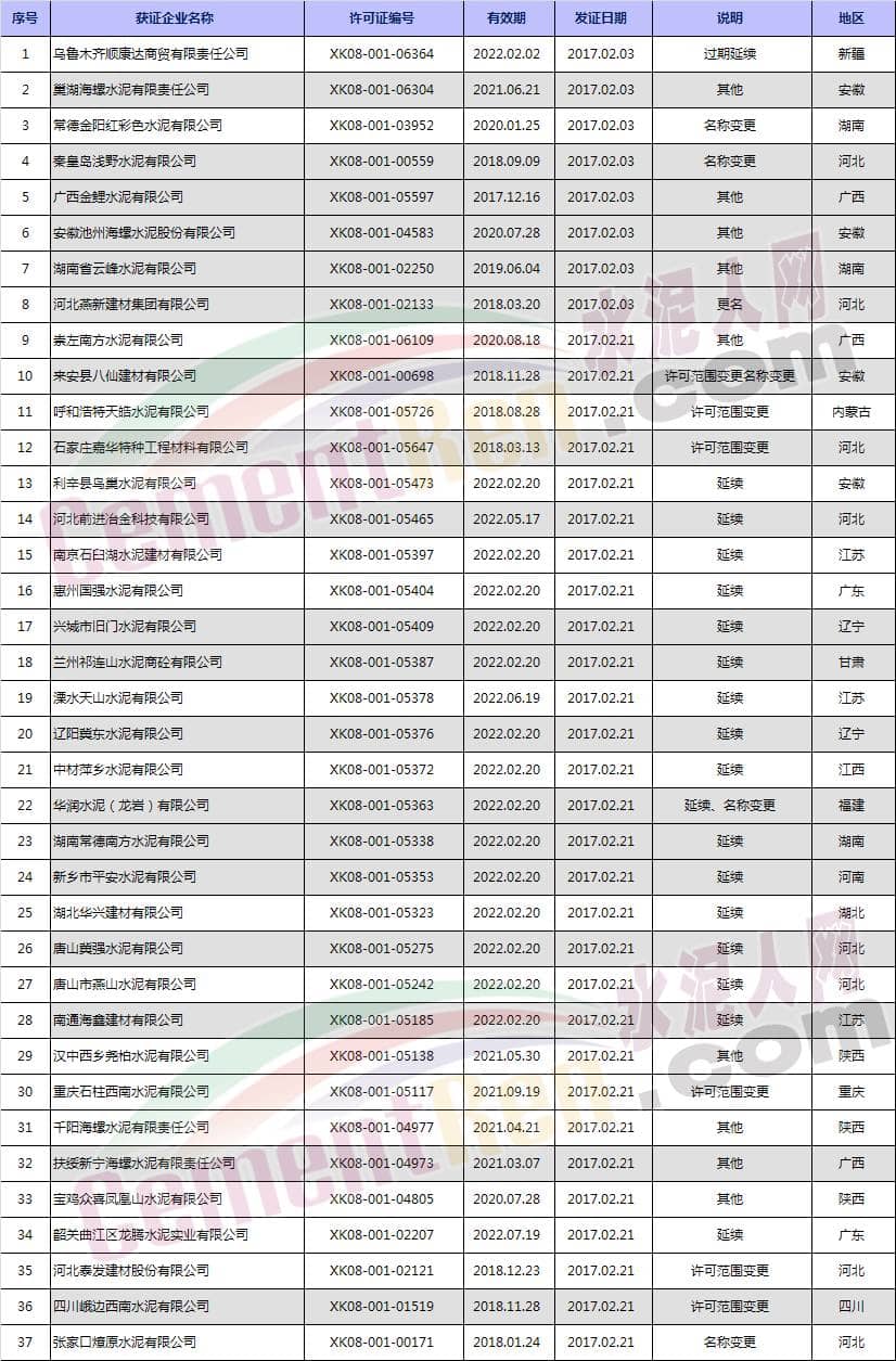 表2:2017年2月份發(fā)證水泥企業(yè)(共37家)