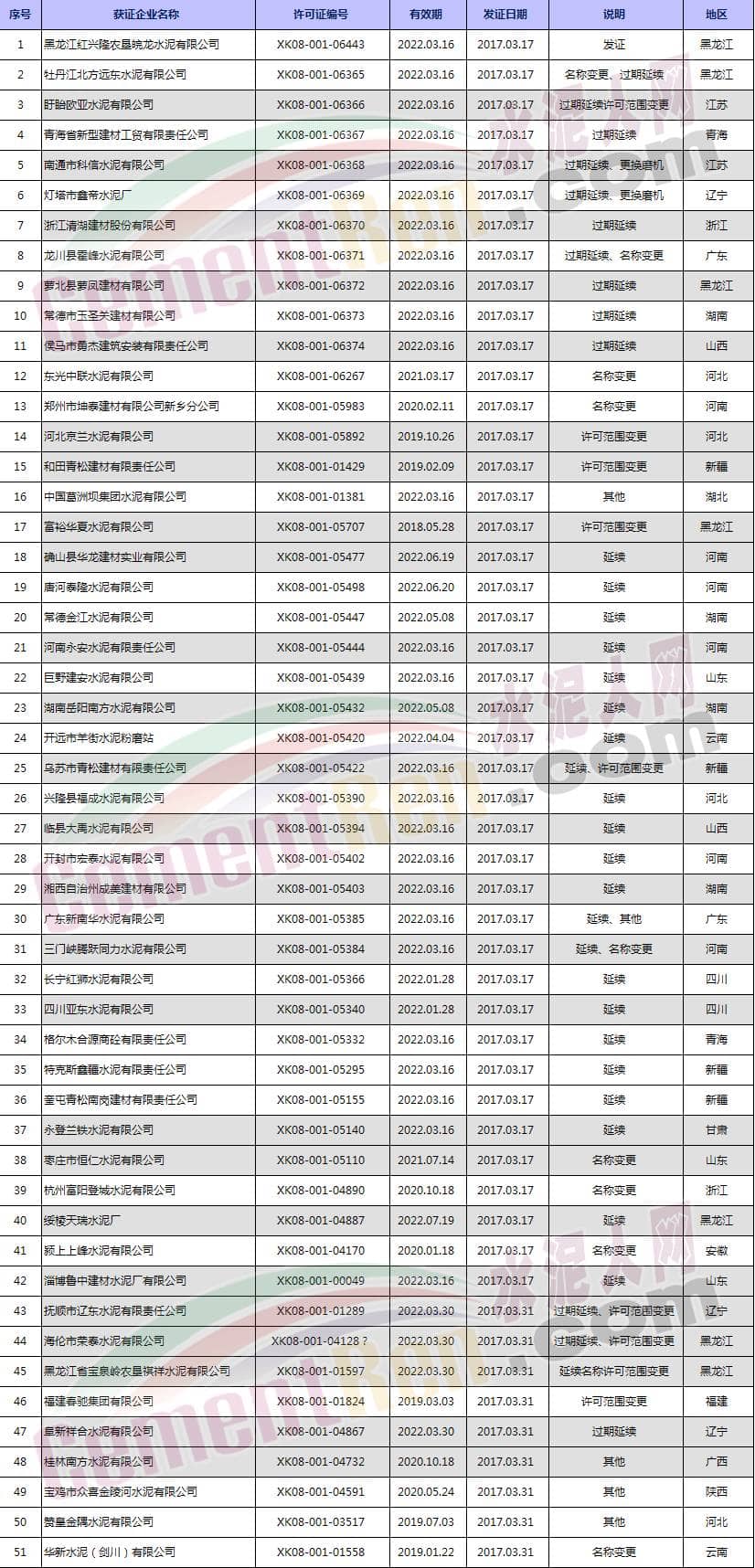 表3:2017年3月份發(fā)證水泥企業(yè)(共51家)