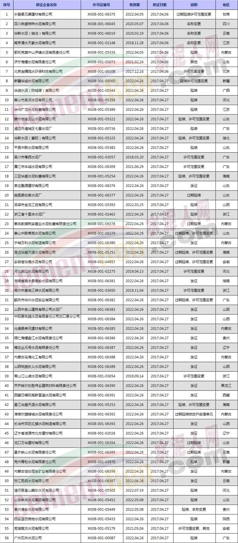 表4:2017年4月份發(fā)證水泥企業(yè)(共56家)