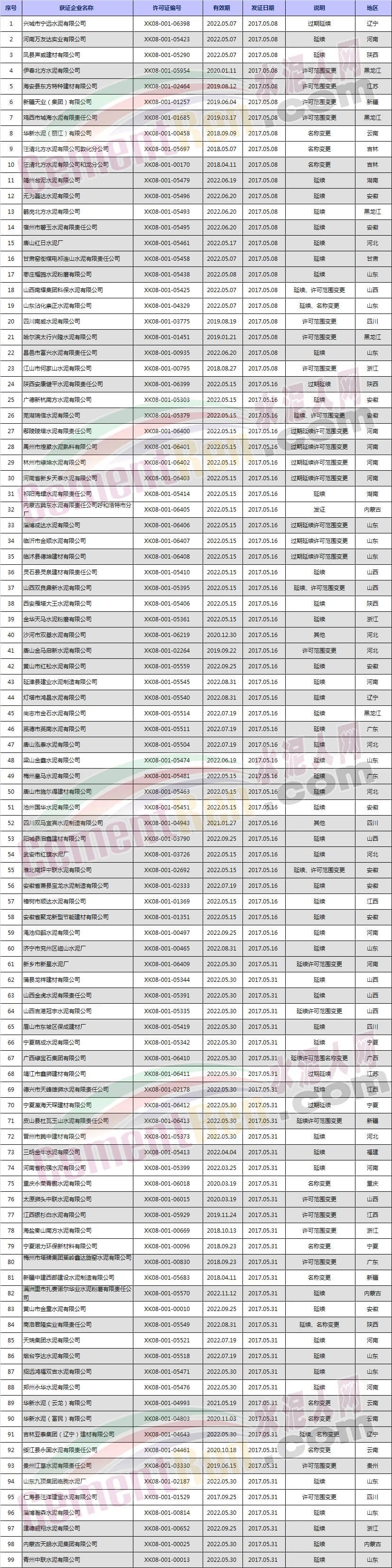 表5:2017年5月份發(fā)證水泥企業(yè)(共99家)