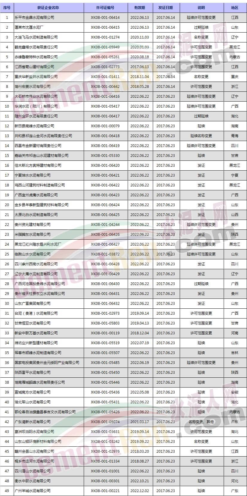 表6:2017年6月份發(fā)證水泥企業(yè)(共49家)