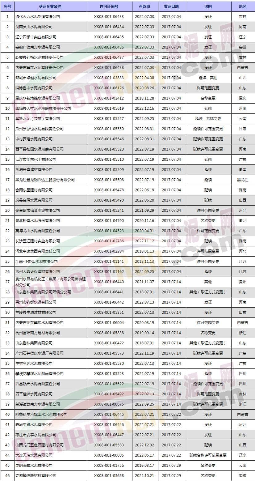 表7:2017年7月份發(fā)證水泥企業(yè)(共46家)