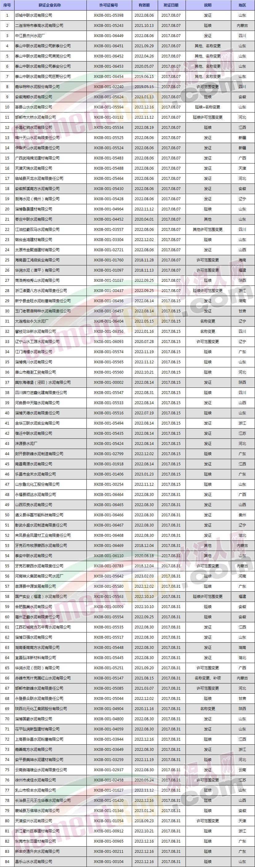 表8:2017年8月份發(fā)證水泥企業(yè)(共84家)