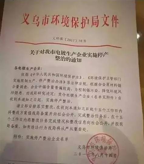 浙江省又開始了新一輪嚴酷的環(huán)境保護治理與整頓,于2017年8月14日下發(fā)正式文件,“依據(jù)《中華人民共和國環(huán)境保護法》、《環(huán)境保護主管部門實施限制生產(chǎn)、停產(chǎn)整治辦法》等法律法規(guī),為降低環(huán)境風險隱患,責令電鍍生產(chǎn)企業(yè)實施停產(chǎn)整治,在十五個工作日內(nèi)將整改任務(wù)完成情況和整改信息向社會公開。”
