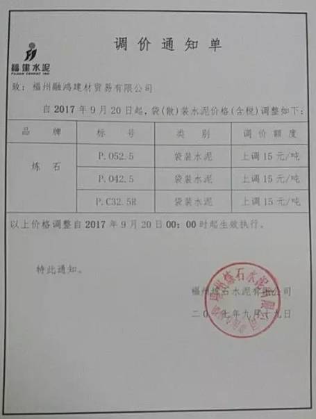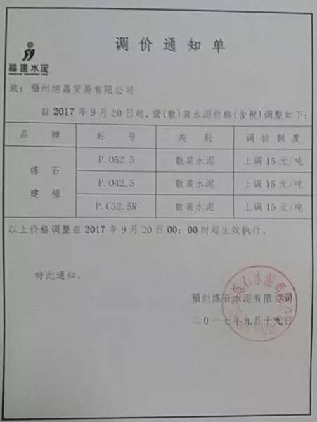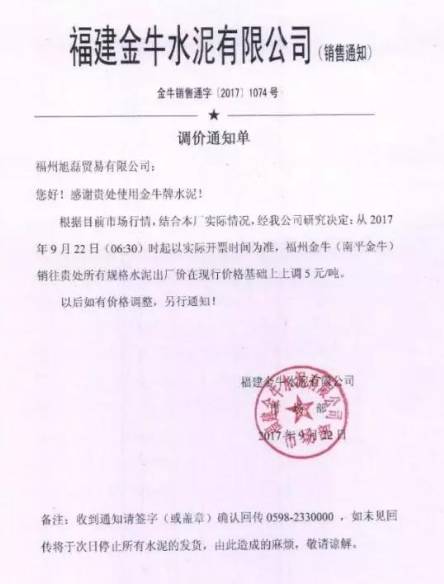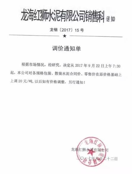 根據(jù)目前市場行情,經(jīng)公司研究決定 ,自2017年9月22日零時(shí)起,我司發(fā)往福建省內(nèi)各區(qū)域的袋、散水泥的出廠價(jià)在原來的價(jià)格基礎(chǔ)上上調(diào)20元/噸。熟料同步上調(diào)20元/噸。