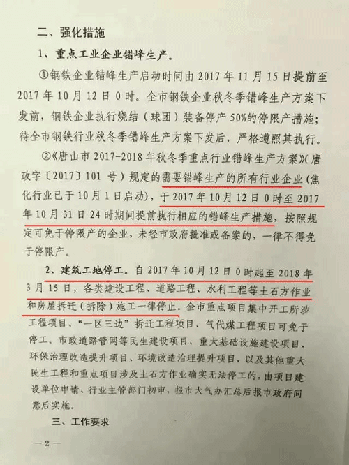 通知要求《唐山市2017-2018年秋冬季重點行業(yè)錯峰生產(chǎn)方案》(唐政字[2017]101號)規(guī)定的需要錯峰生產(chǎn)的所有行業(yè)企業(yè),于2017年10月12日0時至2017年10月31日24時期間提前執(zhí)行相應(yīng)的錯峰生產(chǎn)措施,按照規(guī)定可免于停限產(chǎn)的企業(yè),未經(jīng)市政府批準(zhǔn)或備案的,一律不得免于停限產(chǎn)。