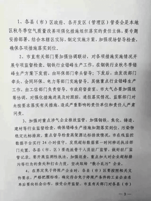 通知稱之所以提前啟動錯峰生產(chǎn)是因為十月份唐山市完成秋冬季大氣污染綜合治理攻堅目標(biāo)形勢嚴(yán)峻,且經(jīng)預(yù)測10月13日、19日唐山市將經(jīng)歷重污染天氣過程。為確保完成國家、省下達的秋冬季空氣質(zhì)量改善目標(biāo),經(jīng)唐山市政府研究決定,在十月份大氣污染綜合治理強化攻堅措施的基礎(chǔ)上,實施進一步的空氣質(zhì)量改善強化措施。