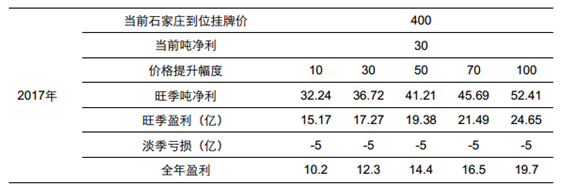 顯而易見,考慮到水泥的區(qū)域性,京津冀的水泥企業(yè)最為受益雄安新區(qū)的建設(shè),主要標(biāo)的是冀東水泥和金隅股份,此外山西、遼寧、內(nèi)蒙也會(huì)受益。我們先對(duì)冀東水泥的盈利做彈性測(cè)算:1、考慮到淡旺季盈利水平的差異較大,我們做了淡季和旺季經(jīng)營(yíng)的一個(gè)拆分。其中11/12/1/2/3 定義為淡季;就 2016 年看,旺季估算盈利 7 億左右,淡季虧損 9 億左右(經(jīng)營(yíng)性利潤(rùn)表現(xiàn))。2、京津冀水泥價(jià)格 4 月初提漲 50 元,對(duì)應(yīng)的石家莊到位掛牌價(jià)在 400 元左右,類比去年 Q4,此價(jià)格下公司旺季的噸凈利在 30 元左右;3、我們?cè)谀壳?400 元的到位掛牌價(jià)基礎(chǔ)上做了測(cè)算,假設(shè)提價(jià) 10-100 元五個(gè)區(qū)間進(jìn)行測(cè)算,結(jié)果顯示,均價(jià)提升 30 元,公司有望實(shí)現(xiàn)旺季盈利 17 億元以上,考慮到淡季一定虧損,全年盈利有望在 12 億以上。4、按照此測(cè)算方法測(cè)算結(jié)果偏謹(jǐn)慎,實(shí)際盈利會(huì)比好于此,源于:第一,價(jià)格執(zhí)行到位的話, 400 元到位價(jià)對(duì)應(yīng)的噸凈利超過(guò) 30 元;第二,并沒(méi)有考慮外圍市場(chǎng)可能價(jià)格也會(huì)提升,尤其是山西和內(nèi)蒙等華北市場(chǎng);第三,沒(méi)有考慮需求量帶來(lái)的增長(zhǎng)。