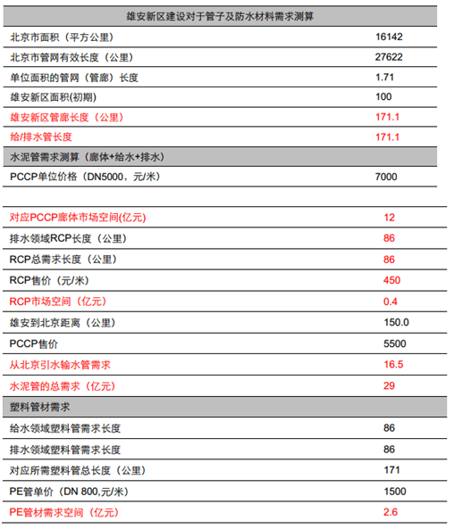 城市管廊:新城區(qū)建設(shè)必將帶動(dòng)管網(wǎng)建設(shè)加速,考慮到雄安建設(shè)基本屬于新城,且中期看綜合管廊建設(shè)必將成為趨勢(shì),我們假設(shè)城區(qū)建設(shè)的管線全部采取管廊方式建設(shè);所有的給排水管全部遷入管廊;主要拉動(dòng)的管子需求為 PCCP、 RCP、塑料管;我們測(cè)算假設(shè)前提如下:1、廊體:采取預(yù)制式, PCCP2、給水:塑料管+球磨鑄鐵,各占 50%;3、排水: RCP+塑料管,各占 50%;;4、遠(yuǎn)程輸水:從水庫(kù)到自來(lái)水廠, PCCP;測(cè)算結(jié)果:1、我們參考北京當(dāng)前的管線密度(單位面積對(duì)應(yīng)的管線長(zhǎng)度)估算雄安新區(qū)的管廊/管線長(zhǎng)度;2、長(zhǎng)距離輸水,我們假設(shè)從北京引水過(guò)來(lái),距離 150 公里, 2 根 PCCP 管并行輸送;3、測(cè)算結(jié)果顯示,初期建設(shè) 100 平方公里的面積,對(duì)應(yīng)水泥管需求在 29 億元,塑料管 2.6 億元,假設(shè) 3 年建設(shè)完成,每年對(duì)應(yīng)的水泥管和塑料管需求在 10 和 0.9 億元。