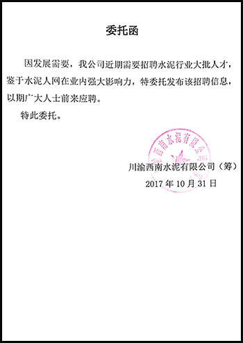 因發(fā)展需要,川渝西南水泥有限公司近期需要招聘水泥行業(yè)大批人才,鑒于水泥人網(wǎng)在業(yè)內(nèi)強大影響力,特委托水泥人網(wǎng)發(fā)布招聘信息,以期廣大水泥行業(yè)從業(yè)者前來去應(yīng)聘。招聘啟示如下: