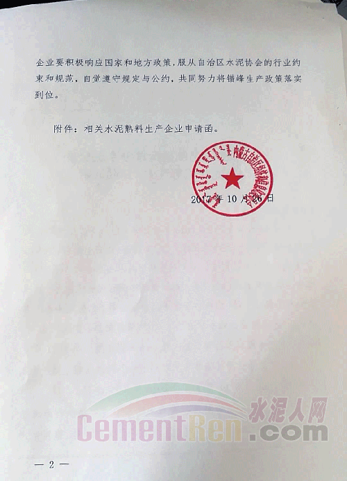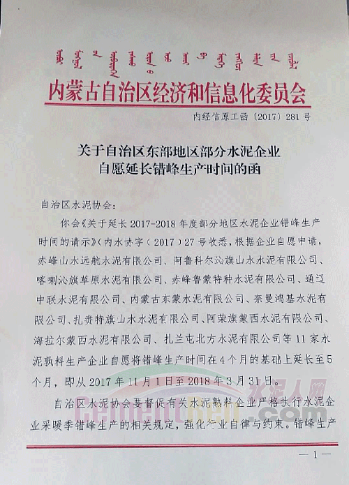 日前,內(nèi)蒙古自治區(qū)經(jīng)信委和環(huán)保廳(內(nèi)經(jīng)信原工字〔2017〕393號)下發(fā)了《關(guān)于2017-2018年度采暖季水泥企業(yè)錯峰生產(chǎn)的通知》通知要求“該地區(qū)各水泥企業(yè)在協(xié)會組織,企業(yè)自愿參與的前提下,可以延長錯峰時間。各地區(qū)也可以根據(jù)當(dāng)?shù)貙?shí)際情況延長錯峰生產(chǎn)時間。”