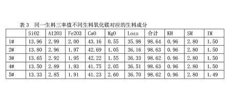 “表3”是同一生料三率值,不同生料氧化鎂對(duì)應(yīng)的生料成分和率值,5組數(shù)據(jù)的三率值相同,氧化鎂不同,三氧化二鐵無很大變化,氧化鈣變化很大,數(shù)據(jù)表明:當(dāng)生料三率值不變時(shí),不同生料氧化鎂對(duì)應(yīng)不同的生料氧化鈣,鈣鐵控制法的關(guān)鍵是保證石灰石氧化鎂穩(wěn)定,如果無法保證石灰石氧化鎂穩(wěn)定,必須同時(shí)測(cè)定出磨生料的氧化鎂,及時(shí)調(diào)整出磨生料氧化鈣的控制指標(biāo)。