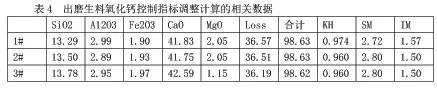 已知生料三率值的目標(biāo)值是KH:0.960;SM:2.80;IM:1.50;出磨生料的氧化鎂是1.15,“表4”是出磨生料氧化鈣控制指標(biāo)調(diào)整計(jì)算的相關(guān)數(shù)據(jù),1#是出磨生料最新的化學(xué)分析數(shù)據(jù),2#是計(jì)算的出磨生料標(biāo)準(zhǔn)成分,3#是計(jì)算的出磨生料氧化鎂標(biāo)準(zhǔn)成分,41.75和1.93分別是氧化鎂在2.05條件下的氧化鈣和三氧化二鐵的控制指標(biāo),42.59和1.97分別是氧化鎂在1.15條件下的氧化鈣和三氧化二鐵的控制指標(biāo)。