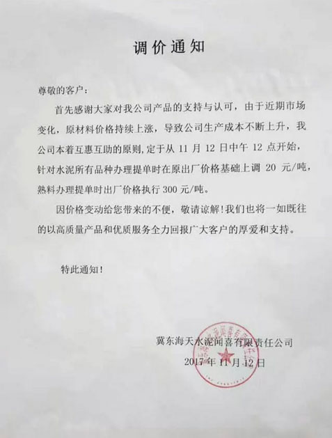 冀東海天水泥聞喜有限責(zé)任公司調(diào)價(jià)通知:由于近期市場(chǎng)變化,原材料價(jià)格持續(xù)上漲,導(dǎo)致公司生產(chǎn)成本不斷上升。本著互惠互助的原則,定于11月12日中午12點(diǎn)開始針對(duì)水泥所有品種辦理提單時(shí)在原出廠價(jià)格基礎(chǔ)上上調(diào)20元/噸,熟料辦理提單時(shí)出廠價(jià)格執(zhí)行300元/噸。