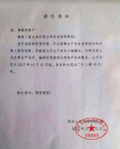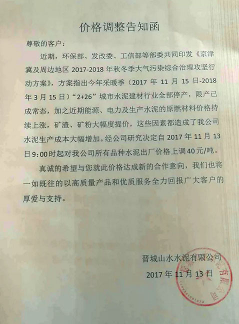 晉城山水水泥提價(jià)通知:近期,環(huán)保部、發(fā)改委、工信部等部委共同印發(fā)《京津冀及周邊地區(qū)2017-2018年秋冬季大氣污染綜合治理攻堅(jiān)行動(dòng)方案》,方案指出今年采暖季(2017年11月15日-2018年3月15日)“2+26”城市水泥建材行業(yè)全部停產(chǎn),限產(chǎn)已成常態(tài),加之近期能源、電力及生產(chǎn)水泥的原燃料材料價(jià)格持續(xù)上漲,礦渣、礦粉大幅度提價(jià),這些因素都造成了我公司水泥生產(chǎn)成本大幅增加。經(jīng)公司決定自2017年11月13日9點(diǎn)對(duì)公司所有品種水泥出廠價(jià)格上調(diào)40元/噸。