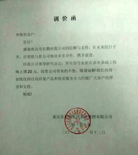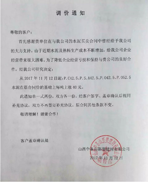 山西中條山新型建材有限公司提價(jià)通知:由于近期水泥及熟料生產(chǎn)成本不斷增加,給企業(yè)經(jīng)營(yíng)帶來很大困難。為了降低企業(yè)經(jīng)營(yíng)虧損和保持與客戶的良好合作,經(jīng)研究決定從11月12日起對(duì)各品種水泥在原合同價(jià)的基礎(chǔ)上每噸上漲40元。