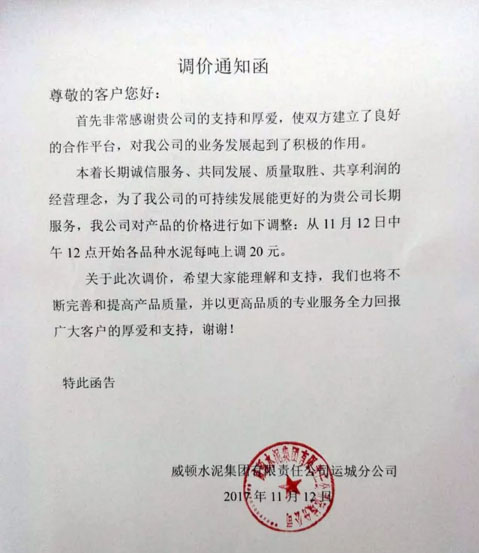 威頓水泥調(diào)價(jià)通知:自11月12日中午12點(diǎn)開始對(duì)旗下各品種水泥每噸上調(diào)20元。