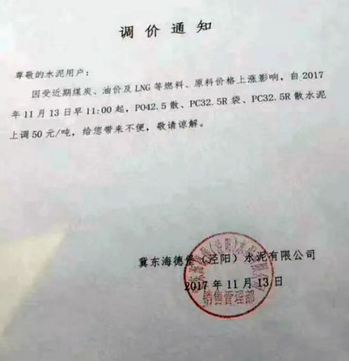冀東海德堡(涇陽(yáng))水泥有限公司提價(jià)通知