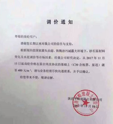 陜西平峰混凝土有限公司提價(jià)通知:根據(jù)現(xiàn)階段國(guó)家源頭治超、鐵腕治污減霾大環(huán)境下,砂石原材料變化及水泥調(diào)價(jià)等市場(chǎng)因素,經(jīng)公司研究決定從2017年11月15日起商砼價(jià)格在原合同及基礎(chǔ)上(C30含稅票、泵送)調(diào)至400元/立方。