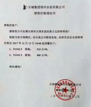 天瑞集團(tuán)鄭州水泥有限公司銷售價(jià)格通知:根據(jù)當(dāng)前市場(chǎng),結(jié)合公司銷售實(shí)際,經(jīng)研究決定水泥銷售價(jià)格自2017年11月13日起調(diào)整為:P.O42.5袋裝510元/噸;P.O42.5散裝480元/噸。