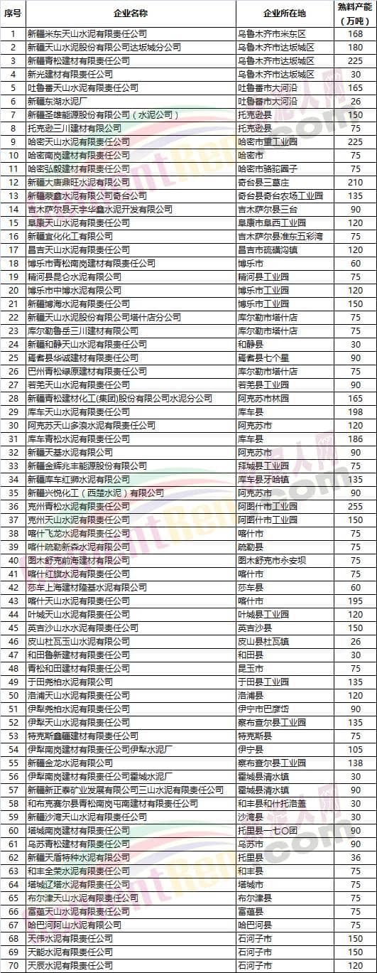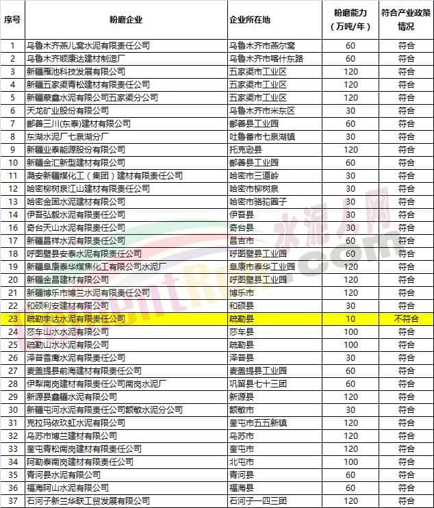 新疆水泥粉磨企業(yè)產能現(xiàn)狀清單