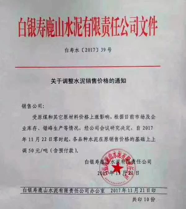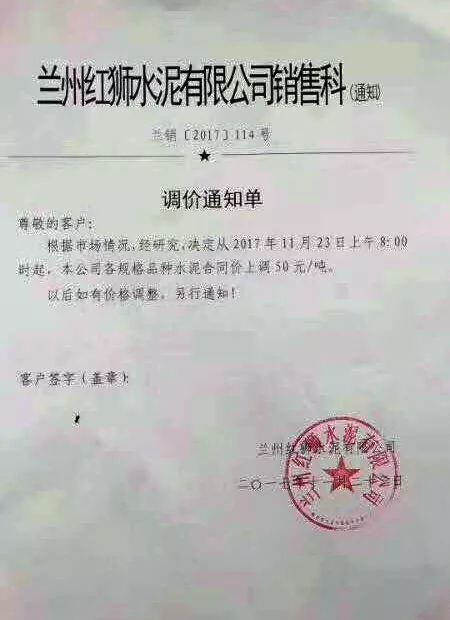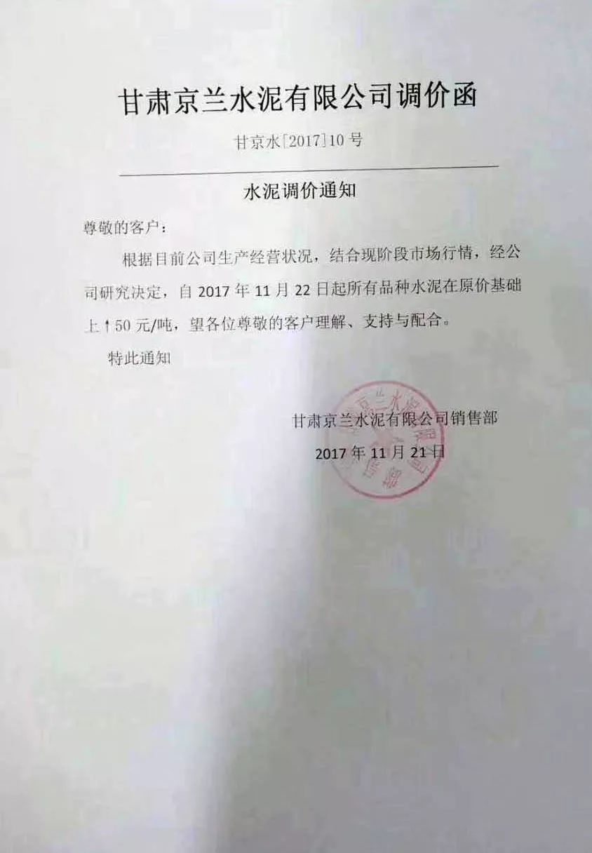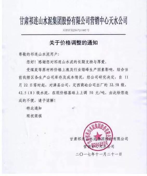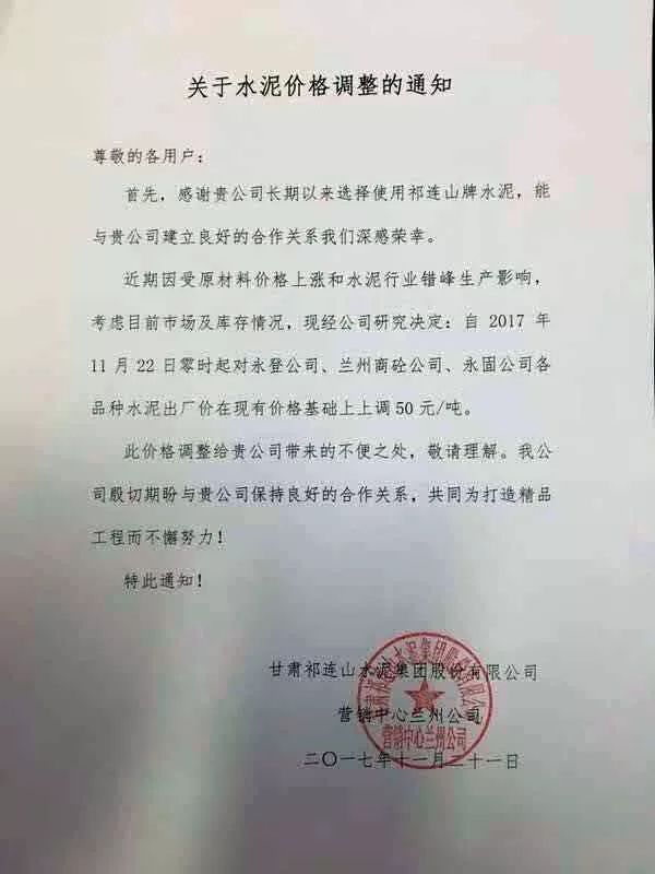 區(qū)域主導(dǎo)企業(yè)祁連山水泥價(jià)格調(diào)整通知稱:因受原材料價(jià)格上漲和水泥行業(yè)錯(cuò)峰生產(chǎn)影響,考慮目前市場及庫存情況,經(jīng)公司研究決定,自2017年11月22日零時(shí)起對永登公司、蘭州商砼公司、永固公司各品種水泥出廠價(jià)在現(xiàn)有價(jià)格基礎(chǔ)上上調(diào)50元/噸。