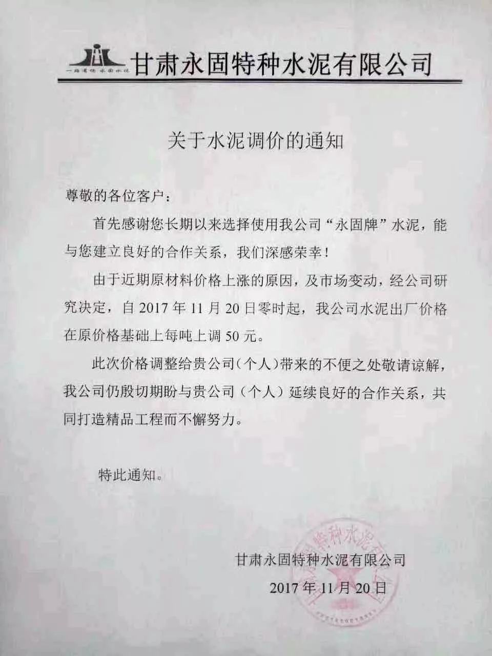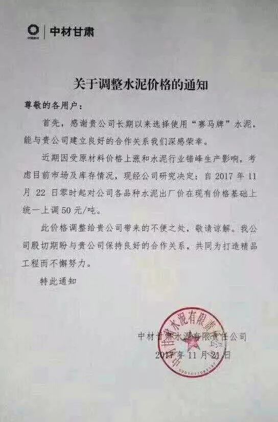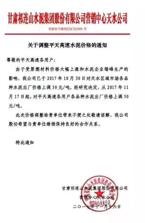 甘肅祁連山水泥集團(tuán)股份有限公司營銷中心天水公司關(guān)于調(diào)整平天高速水泥價(jià)格的通知稱,由于受原燃材料價(jià)格大幅上漲和水泥企業(yè)錯(cuò)峰生產(chǎn)的影響,公司已于2017年10月30日對天水區(qū)域市場各品種水泥出廠價(jià)格上調(diào)50元/噸。經(jīng)研究決定從2017年11月17日起,對平天高速各用戶各品種水泥出廠價(jià)格上調(diào)50元/噸。
