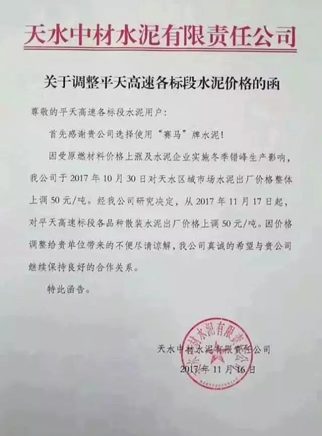 此前區(qū)域主導(dǎo)企業(yè)就曾針對重點(diǎn)工程做過價(jià)格調(diào)價(jià)。天水中材水泥有限責(zé)任公司關(guān)于調(diào)整平天高速各標(biāo)段水泥價(jià)格的函:因受原燃材料價(jià)格上漲及水泥企業(yè)實(shí)施冬季錯(cuò)峰生產(chǎn)影響,公司于2017年10月30日對天水區(qū)域市場水泥 出廠價(jià)格整體上調(diào)50元/噸。經(jīng)公司決定從11月17日起,對平天高速標(biāo)段各品種散裝水泥出廠價(jià)格上調(diào)50元/噸。