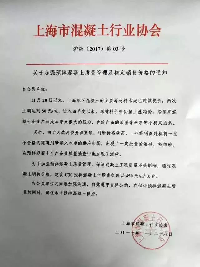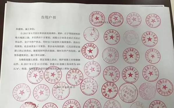告用戶書表示,自2017年9月份以來,水泥連續(xù)系調(diào)價,黃砂、石子等原材料價格大幅度上漲,并且供應(yīng)十分緊張,混凝土行業(yè)各企業(yè)已無法正常運(yùn)作,處于半停產(chǎn)狀態(tài),同時由于原材料大幅度漲價,供應(yīng)日趨緊張,混凝土企業(yè)資金十分緊張,靠企業(yè)內(nèi)部挖潛,已無法保證混凝土的正常供應(yīng)。隨著原材料供應(yīng)緊缺,隨時有停產(chǎn)的危險,希望各建筑、施工單位諒解。