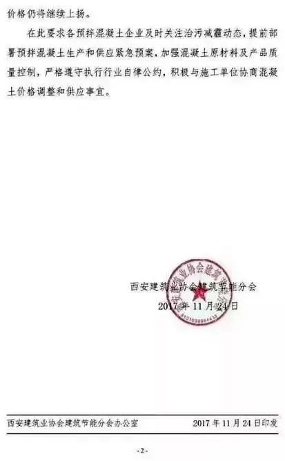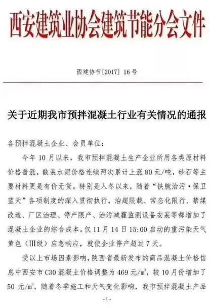 此前西安建筑業(yè)協(xié)會建筑節(jié)能分會曾發(fā)布關(guān)于近期西安預(yù)拌混凝土行業(yè)有關(guān)情況的通報(bào),通報(bào)稱,今年10月以來,西安市預(yù)拌混凝土生產(chǎn)企業(yè)所用各類原材料價格普漲,散裝水泥價格連續(xù)兩次累計(jì)上漲80元/噸,砂石等主要材料更是有價無貨。特別是入冬以來,隨著“鐵腕治污,保衛(wèi)藍(lán)天”各項(xiàng)制度的深入貫徹執(zhí)行,治超限載,常態(tài)化限行、禁煤改造,廠區(qū)治理,停產(chǎn)限產(chǎn)、治污減霾監(jiān)測設(shè)備安裝等都增加了混凝土企業(yè)的綜合成本。僅11月14日15:00啟動的重污染天氣黃色應(yīng)急響應(yīng),就使企業(yè)停產(chǎn)超過七天。
