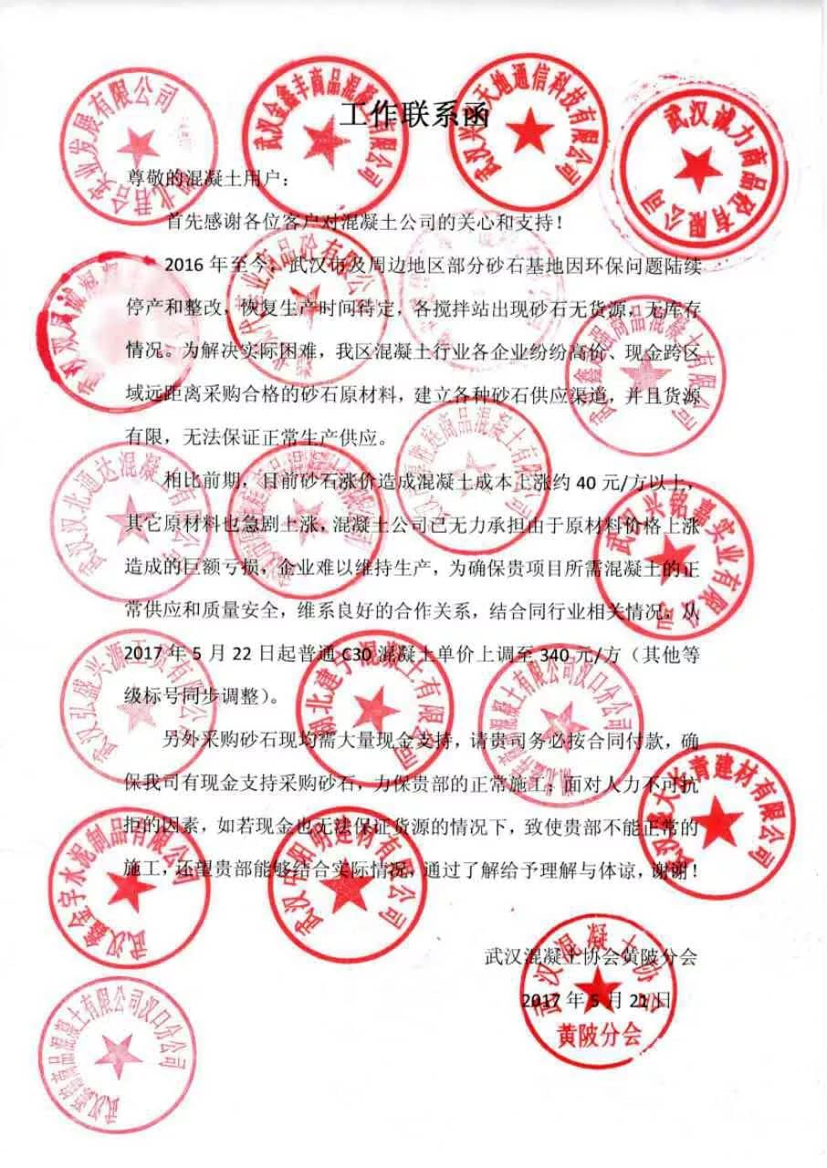 今年五月份的時候,武漢混凝土協(xié)會黃陂分會就曾發(fā)布工作聯(lián)系函,聯(lián)系函稱,2016年至今,武漢市及周邊地區(qū)部分砂石基地因環(huán)保問題陸續(xù)停產(chǎn)和整改,恢復(fù)生產(chǎn)時間待定,各攪拌站出現(xiàn)砂石無貨源,無庫存情況。為解決實(shí)際困難,區(qū)混凝土行業(yè)各企業(yè)紛紛高價、現(xiàn)金跨區(qū)域遠(yuǎn)距離采購合格的砂石原材料,建立各種砂石供應(yīng)渠道,并且貨源有限,無法保證正常生產(chǎn)供應(yīng)。