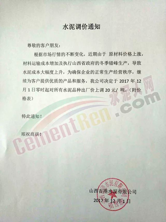 感謝您對我公司長期以來的信賴與支持,根據(jù)近期市場變化及公司產(chǎn)銷形勢,決定于2017年12月1日00:00起對各品種水泥價(jià)格上調(diào)20元/噸,順祝商祺!