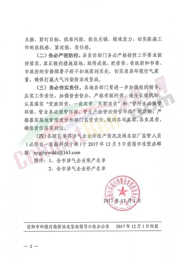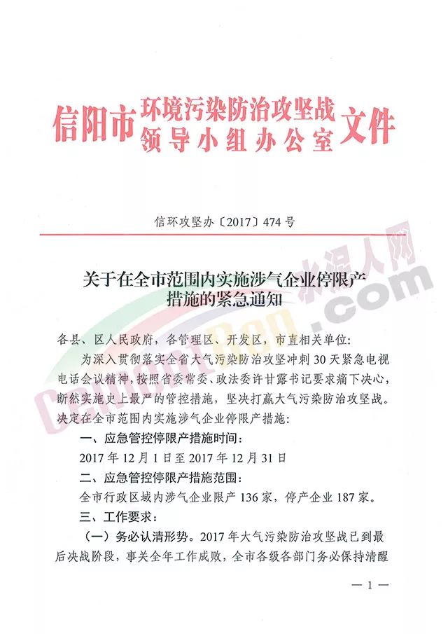 【水泥人網(wǎng)】日前,信陽市環(huán)境污染防治攻堅(jiān)戰(zhàn)領(lǐng)導(dǎo)小組辦公室發(fā)布《關(guān)于在全市范圍內(nèi)實(shí)施涉氣企業(yè)停限產(chǎn)措施的緊急通知》,通知要求在2017年12月1日至12月31日間在全市范圍內(nèi)實(shí)施涉氣企業(yè)停限產(chǎn)措施。全市行政區(qū)域內(nèi)涉氣企業(yè)限產(chǎn)共136家,停產(chǎn)企業(yè)187家。其中包括以下水泥企業(yè):