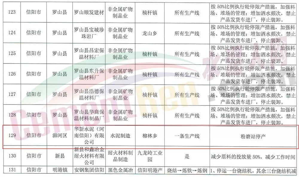 1 華新水泥(河南信陽)有限公司粉磨站停產(chǎn);