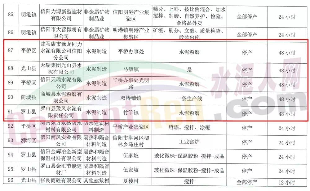 4 信陽天瑞水泥有限公司水泥粉磨站停產(chǎn)48小時(shí);