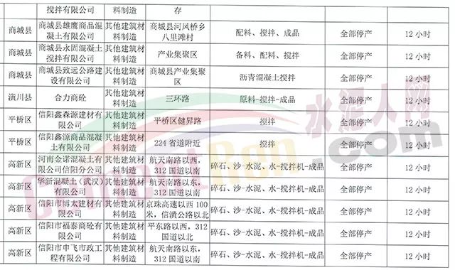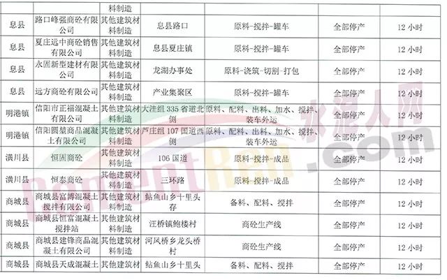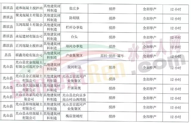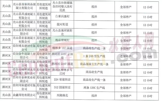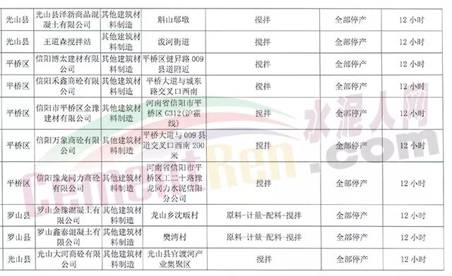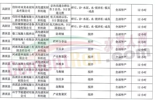 文件要求信陽市水泥下游混凝土攪拌站、商砼企業(yè)也將限產(chǎn),具體企業(yè)名單如下: