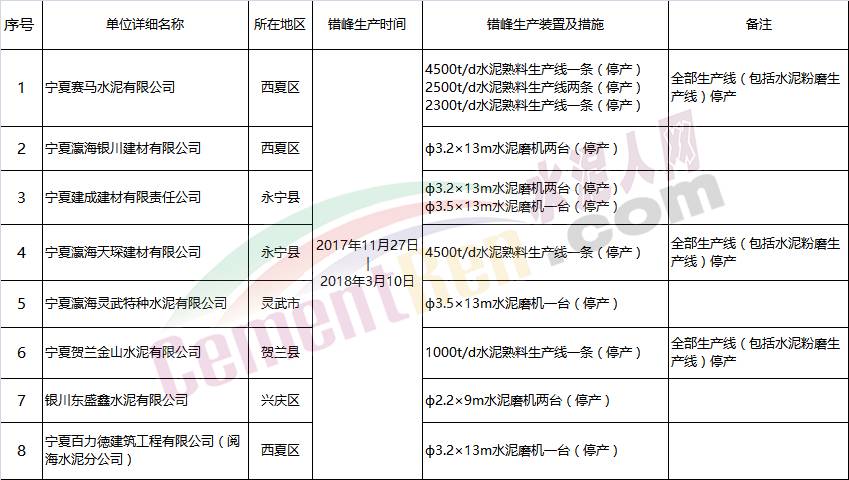 銀川市錯峰生產(chǎn)水泥企業(yè)名單