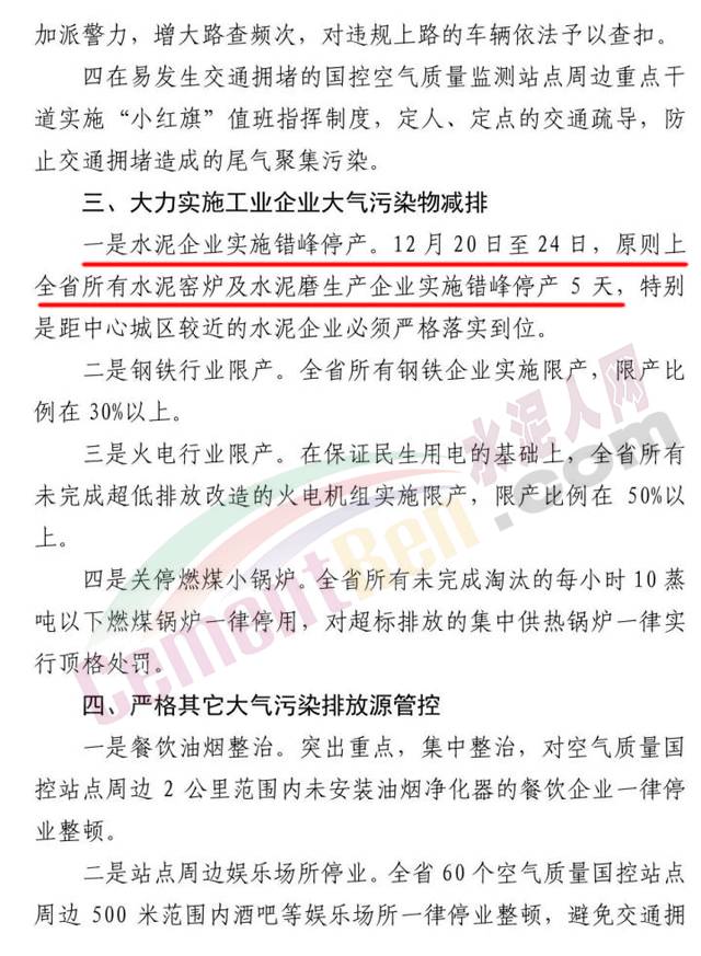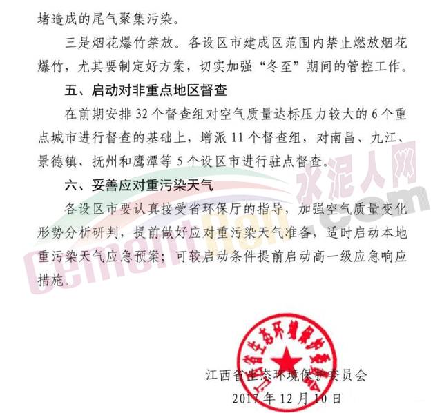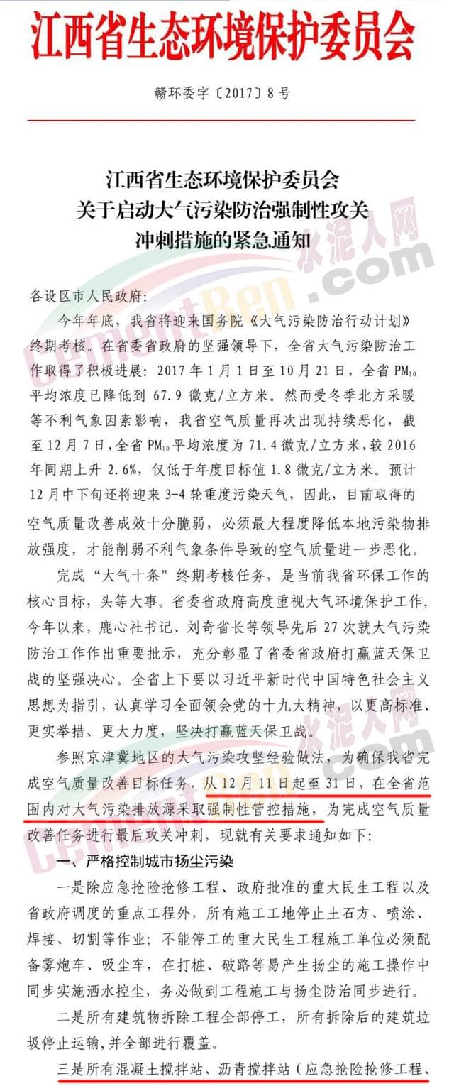 【水泥人網(wǎng)】近日,江西省生態(tài)環(huán)境保護(hù)委員會發(fā)布了關(guān)于啟動大氣污染防治強(qiáng)制性攻關(guān)沖刺措施的緊急通知,通知要求參照京津冀地區(qū)的大氣污染攻堅經(jīng)驗作法,確保江西全省完成空氣質(zhì)量改善目標(biāo)任務(wù),從12月11日起至31日在全省范圍內(nèi)對大氣污染排放源采取強(qiáng)制管控措施。對所有混凝土攪拌站(應(yīng)急搶險搶修工程、政府批準(zhǔn)的重大民生工程以及省政府調(diào)度的重點工程除外)全部停產(chǎn)。以水泥企業(yè)實施錯峰停產(chǎn)。12月20日至24日,全省所有水泥窯爐及水泥磨生產(chǎn)企業(yè)實施錯峰停產(chǎn)5天,特別是距中心城區(qū)較近的水泥企業(yè)必須嚴(yán)格落實到位。