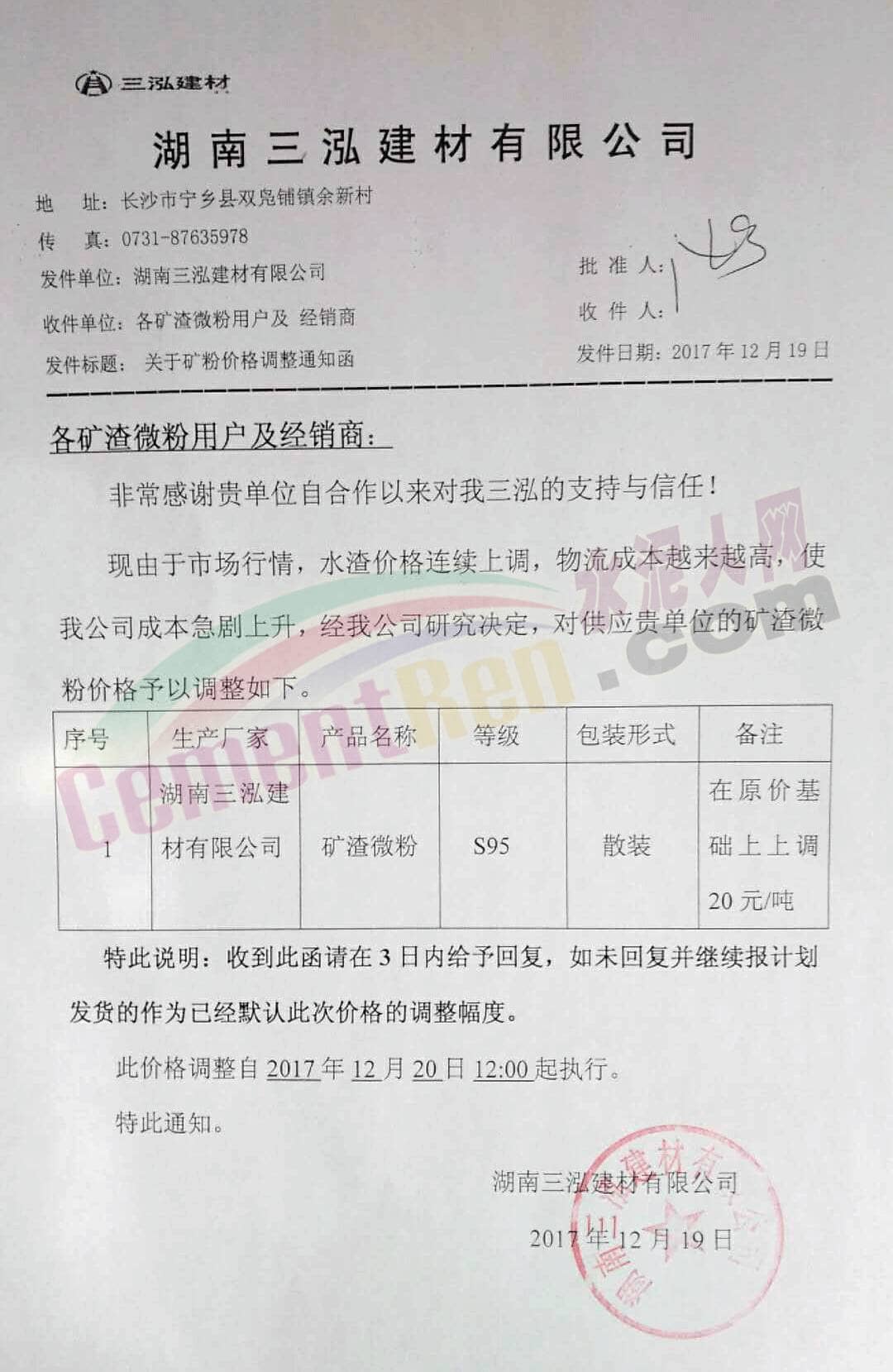12月20日,湖南華菱湘潭鋼鐵有限公司銷售部向湖南華新湘鋼水泥公司 湖南華湘環(huán)保產(chǎn)業(yè)發(fā)展有限公司發(fā)出關(guān)于12月下旬水渣價格調(diào)整的通知。