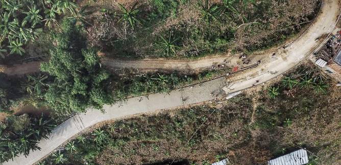 ▲ 硬化后的組組通公路像一條蛟龍?jiān)谏介g