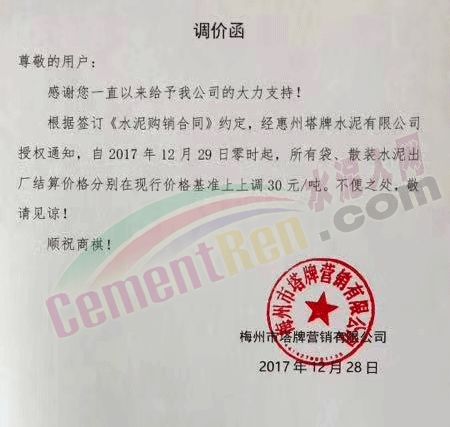 【水泥人網】昨日,梅州市塔牌營銷有限公司發(fā)布提價通知稱:根據(jù)簽訂《水泥購銷合同》約定,經惠州塔牌水泥有限公司授權通知,自今日(29日)零時起,所有袋、散裝水泥出廠結算價格分別在現(xiàn)行價格基準上上調30元/噸。