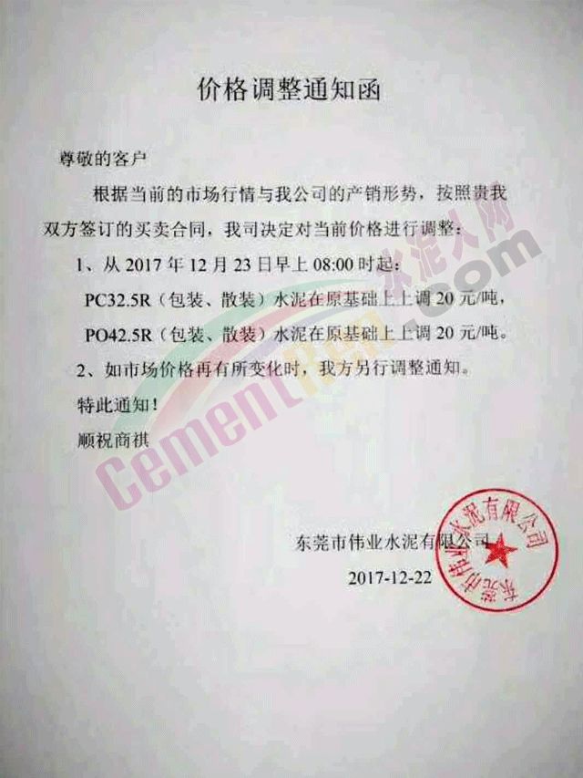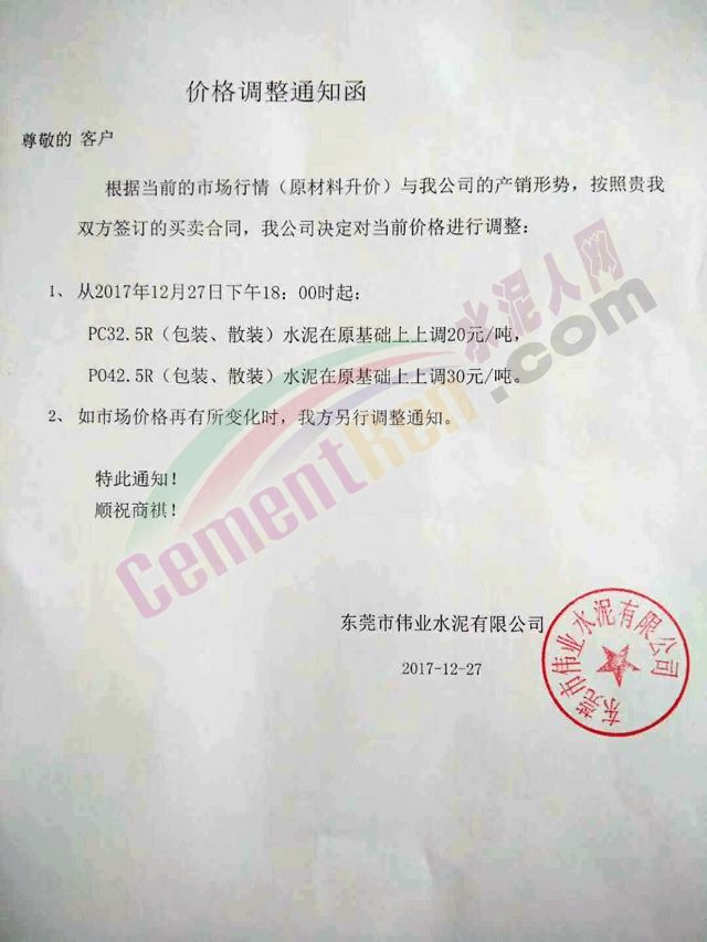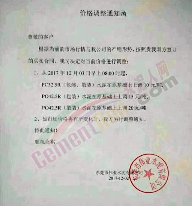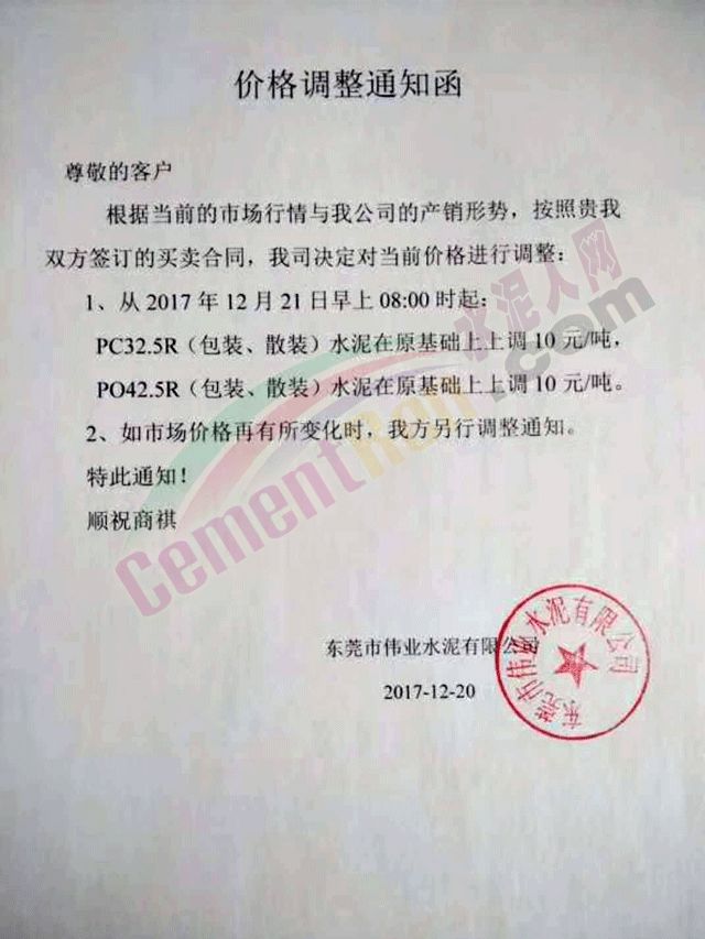 據(jù)水泥人網了解,廣東東莞市偉業(yè)水泥有限公司近七天內三次上調水泥價格。其中PC32.5R袋裝、散裝水泥七天共漲價50元/噸;PO42.5袋裝、散裝水泥七天共漲60元/噸。