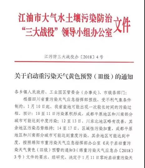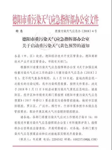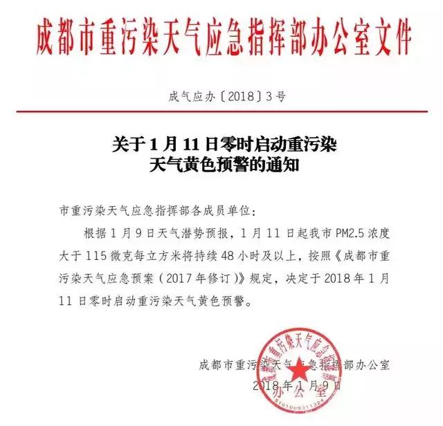 根據(jù)省環(huán)境監(jiān)測總站和省氣象臺會商研判,成都、自貢、瀘州、德陽、綿陽、遂寧、內江、樂山、 宜賓、達州、雅安、眉山、資陽13個城市將采取聯(lián)防聯(lián)控措施,于1月11曰零時同步啟動重污染天氣黃色預警。