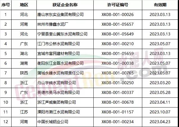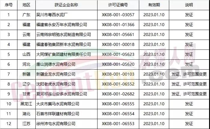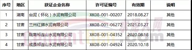 2018年1月11日質(zhì)檢總局發(fā)放到期延續(xù)的水泥企業(yè)生產(chǎn)許可證共12家