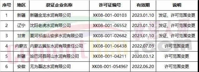 2018年1月11日放發(fā)涉及許可證范圍變更的共6家水泥企業(yè)