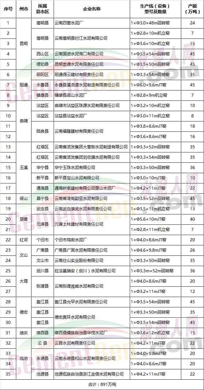 2017云南水泥行業(yè)落后產(chǎn)能淘汰清單