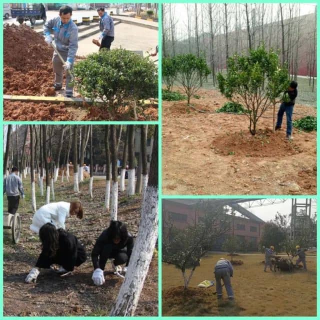 職工正在為樹苗培土